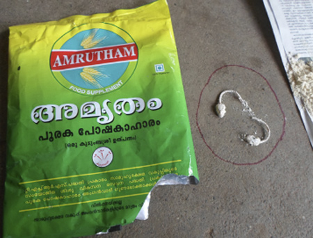നവംബര് മാസം അവസാനമാണ് അങ്കണവാടിയില്നിന്ന് നാലുകവര് അമൃതംപൊടി അര്ജുനന് ലഭിച്ചത്. ബാക്കി മൂന്നു കവറുകള്ക്കുള്ളിലും പ്രശ്നങ്ങള് ഇല്ലായിരുന്നു.